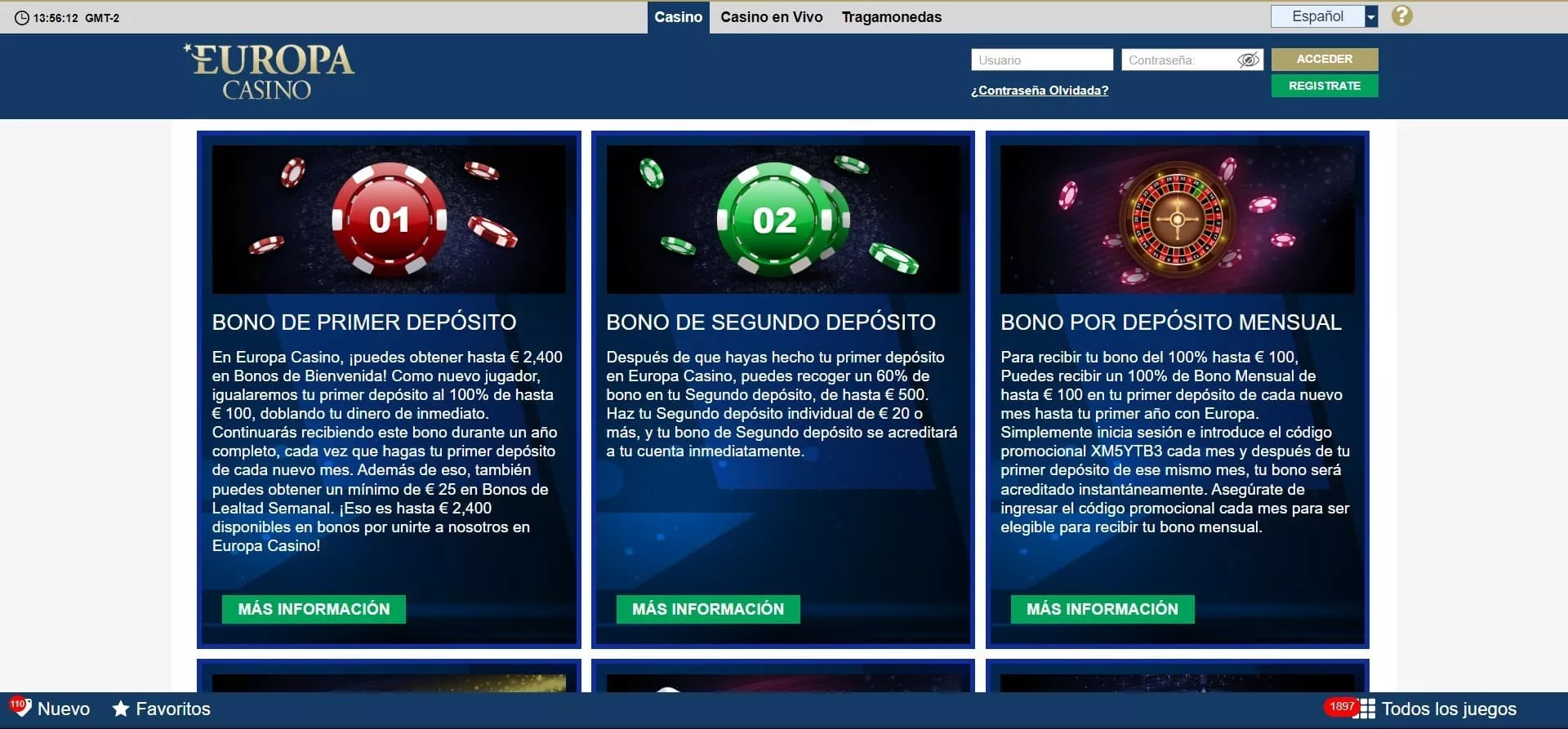 El Europa casino bono de bienvenida ofrece el 100% de tu primer depósito hasta $2.400. Además, cuenta con varias promociones por depósitos semanales y mensuales, un programa de referidos, en el que puedes obtener bonos sin depósito de Europa casino por cada amigo que se registre, y un programa VIP con un bono de lealtad por depósitos semanales. Además, cuenta con código promocional Europa casino que puedes obtener de sus páginas asociadas o de promociones temporales.